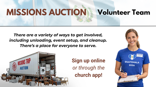 We’re building a team of helpers for the auction, with opportunities including unloading, setup, and cleanup—there’s a place for everyone to serve.