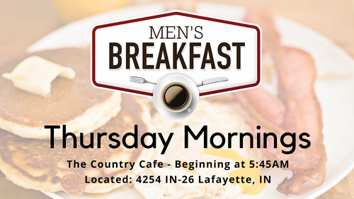 The Thursday morning men's breakfast is a casual breakfast for men to share a meal and build relationships with fellow believers before they begin their day. They meet weekly at The Country Cafe located at 4254 IN-26, Lafayette IN. beginning at 5:45AM.